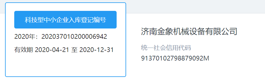 根據《科技型中小企業評價辦法》(國科發政〔2017〕115號)和省科技廳《關于開展2020年科技型中小企業評價工作的通知》等文件有關規定,現認定濟南金象機械設備有限公司成為“國家科技型中小企業”,編號:202037010200006942。